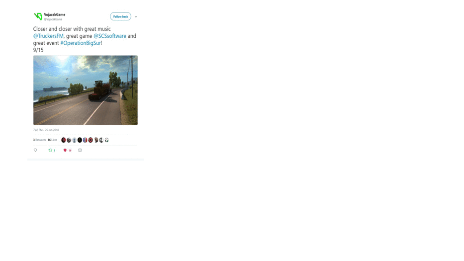 We know that the truck sim fan base of operations is really active, simply nosotros stimulate got been however surprised yesteryear the enthusiasm too commitment of the community. Immediately afterward the event's launch, thousands too thousands of private players, equally good equally many VTC's, came to help, frequently going beyond the requested quota. Our twitter with the #OperationBigSur tag too all social media stimulate got gone ballistic amongst too then many reports too cool pictures illustrating the effort. The potent squad spirit has been raised fifty-fifty to a greater extent than yesteryear a steady flow of music carefully picked for you lot yesteryear our friends at TruckersFM radio.
